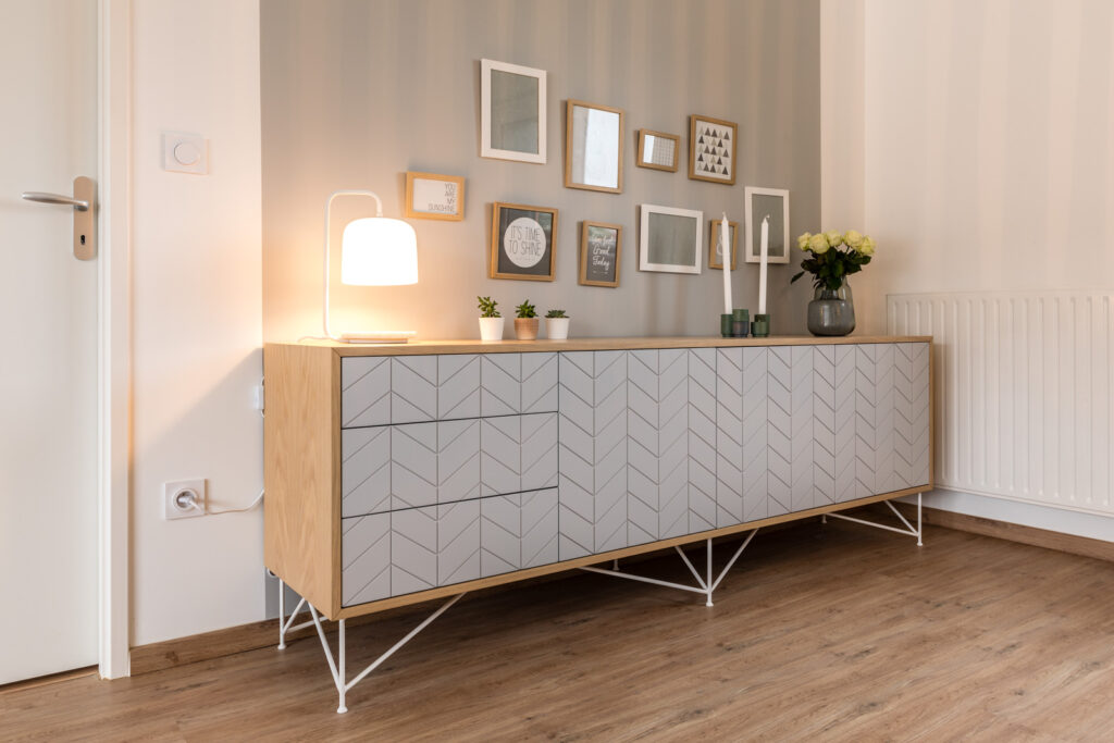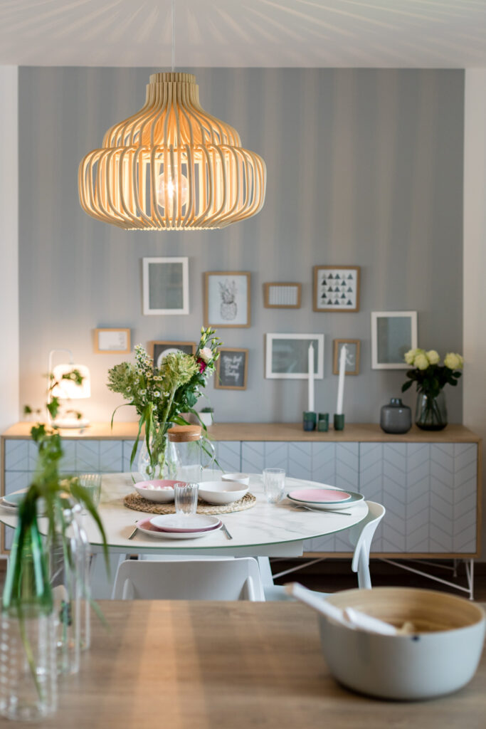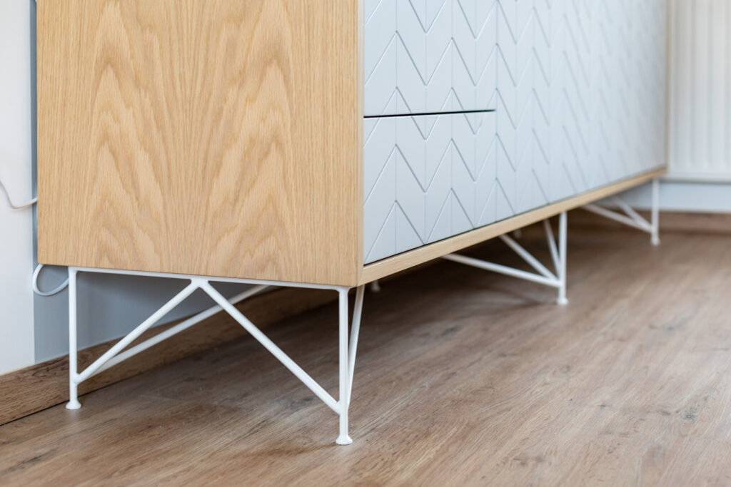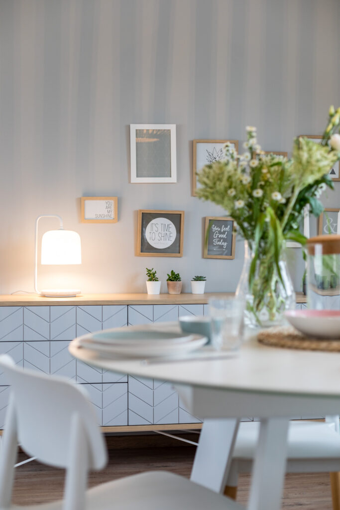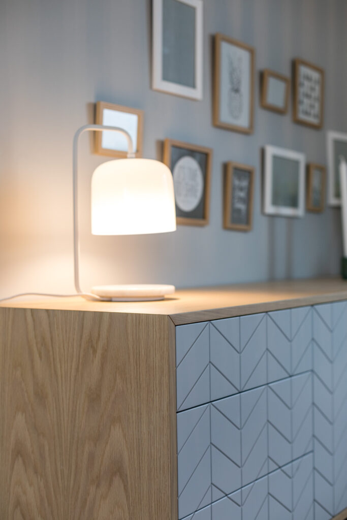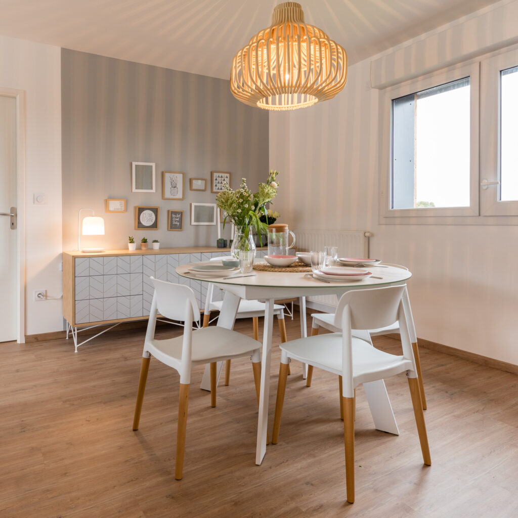 Dans l’espace repas, une table en marbre blanc associée à des chaises design scandinave s’accorde avec un meuble dessiné pour le projet, une enfilade d’inspiration scandinave avec des façades gravées et un pieds en métal banc pour plus de légèreté.