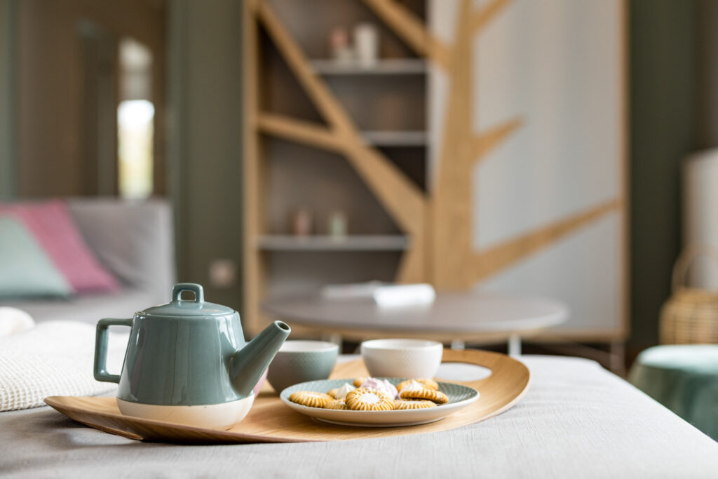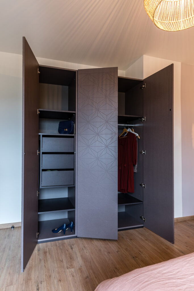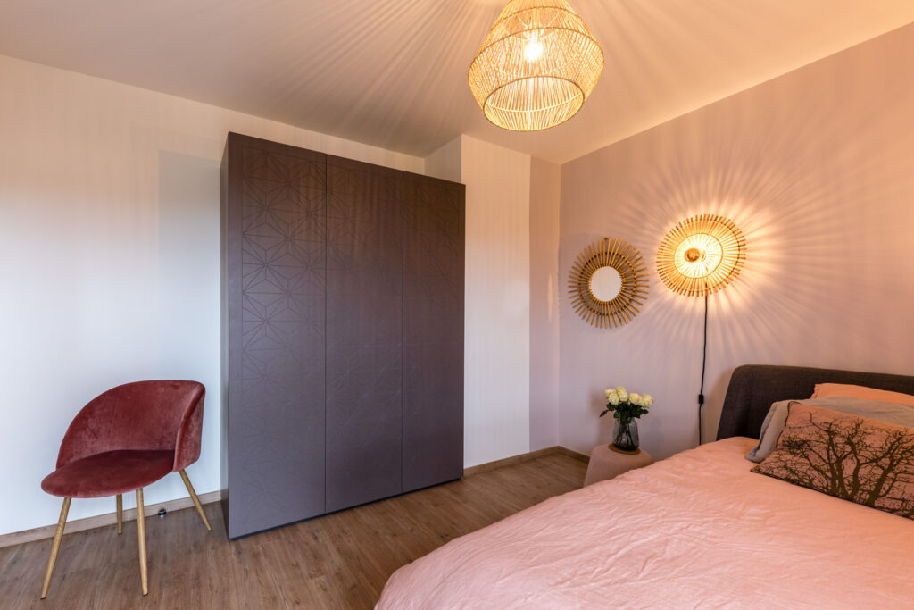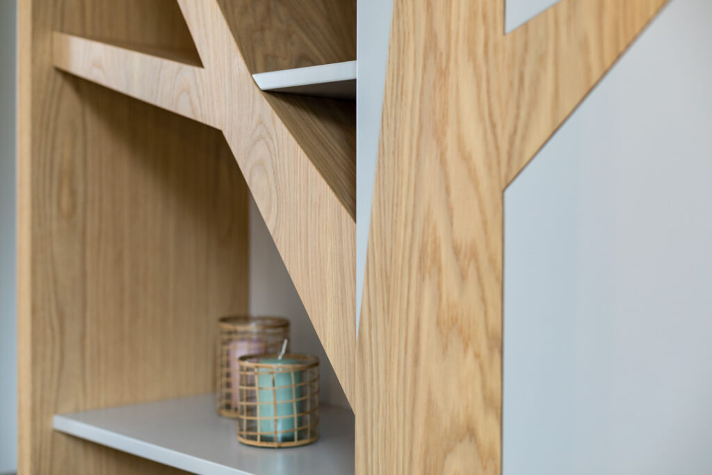 La grande force du projet est dans le choix des déco épurées et la sélection des matériaux nobles et naturels, les meubles sont en chêne véritable, le canapé en lin naturel, les luminaires en ratan, la table en céramique marbre et les dressing en valchromat.